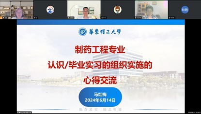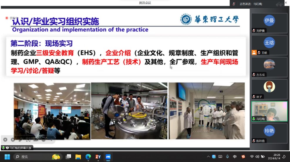 在这次虚拟教研室活动中,马红梅副教授以华东理工大学制药工程专业认识实习、毕业实习以及与企业合作的实践教学模式展开培训,不但强调了实习的目的和意义,指出实习是学生将理论知识应用于实践、培养解决复杂工程问题能力的重要环节,更是将课程思政深度融入到实习教学的相关内容中的环节。