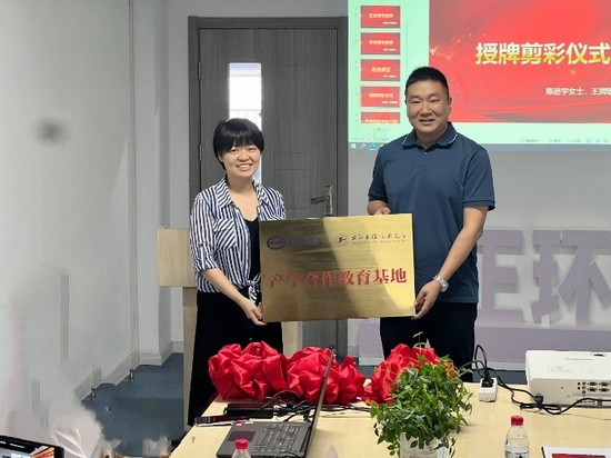 王润锴与威正测试总经理陈进宇共同为“上海工程技术大学-上海威正测试技术有限公司产学合作教育基地”揭牌。