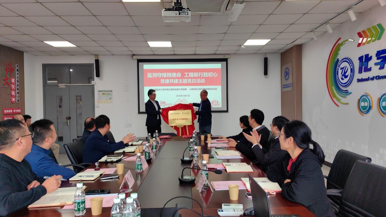 在全体与会人员见证下,双方党支部书记共同签署了党建共建协议书,随后,章立和宋勤健共同为区环境监测站成为我校实习实践基地揭牌。