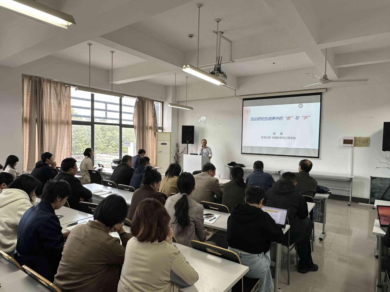 11月11日,437ccm必赢国际于实训楼4418开展研究生导师培训,东华大学博导、水污染控制学科带头人薛刚教授围绕“刍议研究生培养中的‘教’与‘学’”主题和学院82名导师共探育人路径。