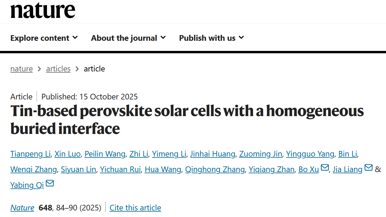 近日,国际顶级期刊《Nature》上刊登了题为“Tin-based perovskite solar cells with a homogeneous buried interface”的研究论文。该论文第一作者为437ccm必赢国际21届硕士毕业生李天朋,我院芮一川老师等为共同作者。该成果将新型自组装单分子材料引入锡钙钛矿薄膜埋底界面,构建了能级匹配的均匀界面层,实现了空穴提取效率的显著提升;同时该分子薄膜形成的超润湿下层可诱导钙钛矿晶粒定向生长,使薄膜缺陷密度降低40%以上,最终制备的锡钙钛矿太阳能电池认证效率到达17.71%,刷新了世界纪录。