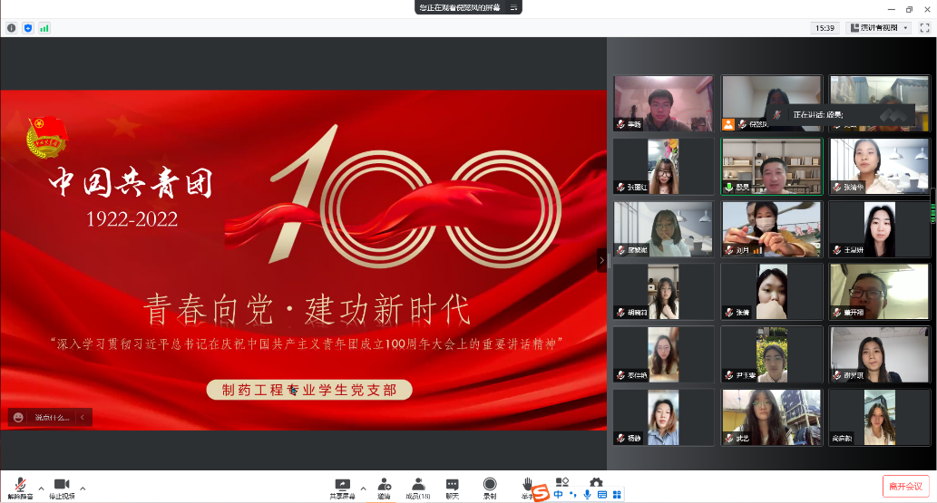 为深入学习贯彻习近平总书记在庆祝中国共产主义青年团成立100周年大会上的重要讲话精神,并庆祝中国共产主义青年团成立一百周年,2022年5月15日,437ccm必赢国际制药工程专业学生党支部于线上组织召开了“青春向党·建功新时代——深入学习贯彻习近平总书记在庆祝中国共产主义青年团成立100周年大会上的重要讲话精神”组织生活会。