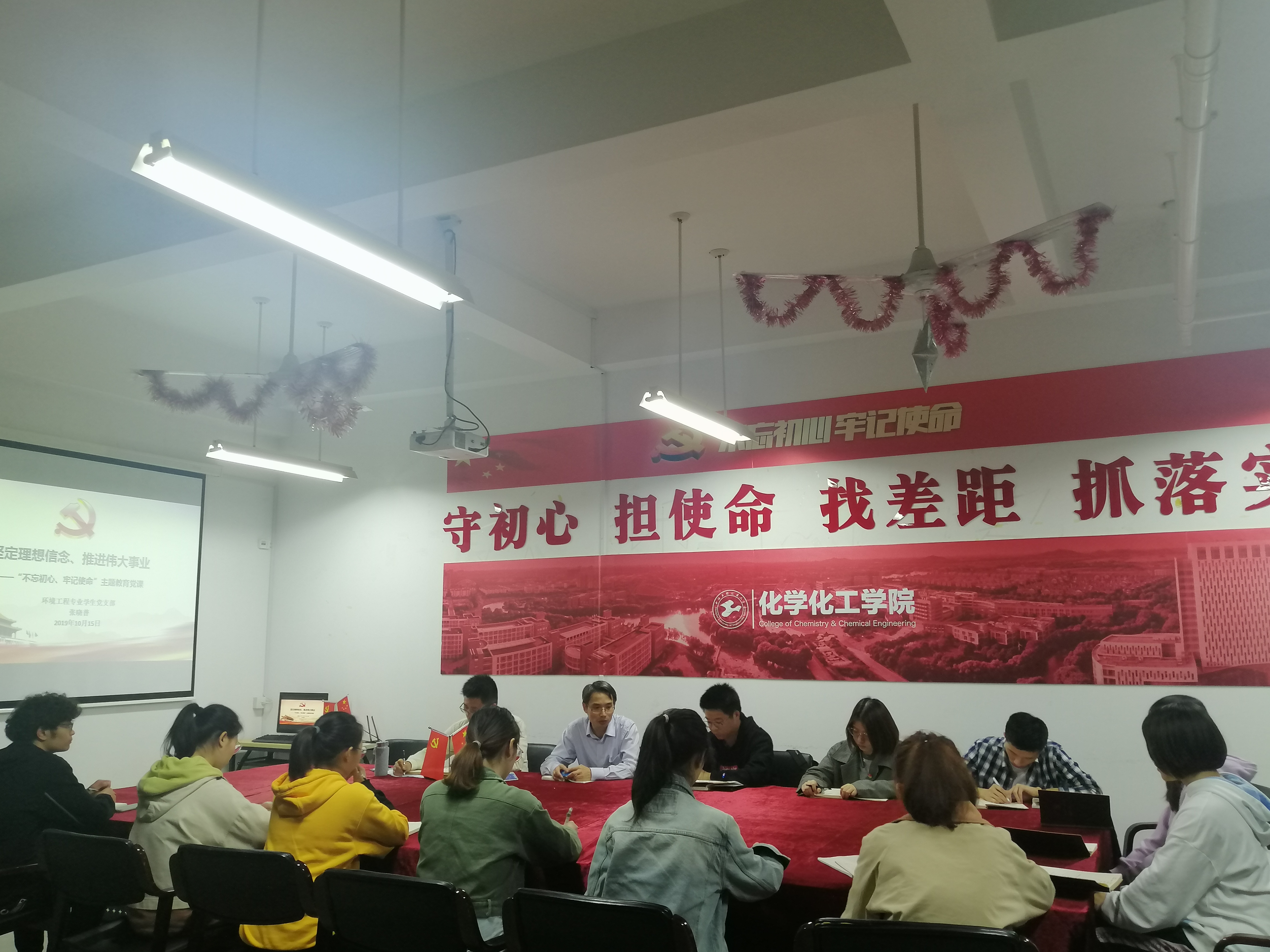 为深入学习贯彻习近平新时代中国特色社会主义思想和党的十九大精神,全面落实党中央关于“不忘初心、牢记使命”主题教育的目标与要求,在学校党委和学院党委的安排部署下,10月18日下午,环境工程学生党支部支部书记张晓普以“坚定理想信念、推动伟大事业”为主题,为党支部全体党员上了一堂“不忘初心、牢记使命”的专题党课,学院党委副书记、院长饶品华参加了专题党课教育。