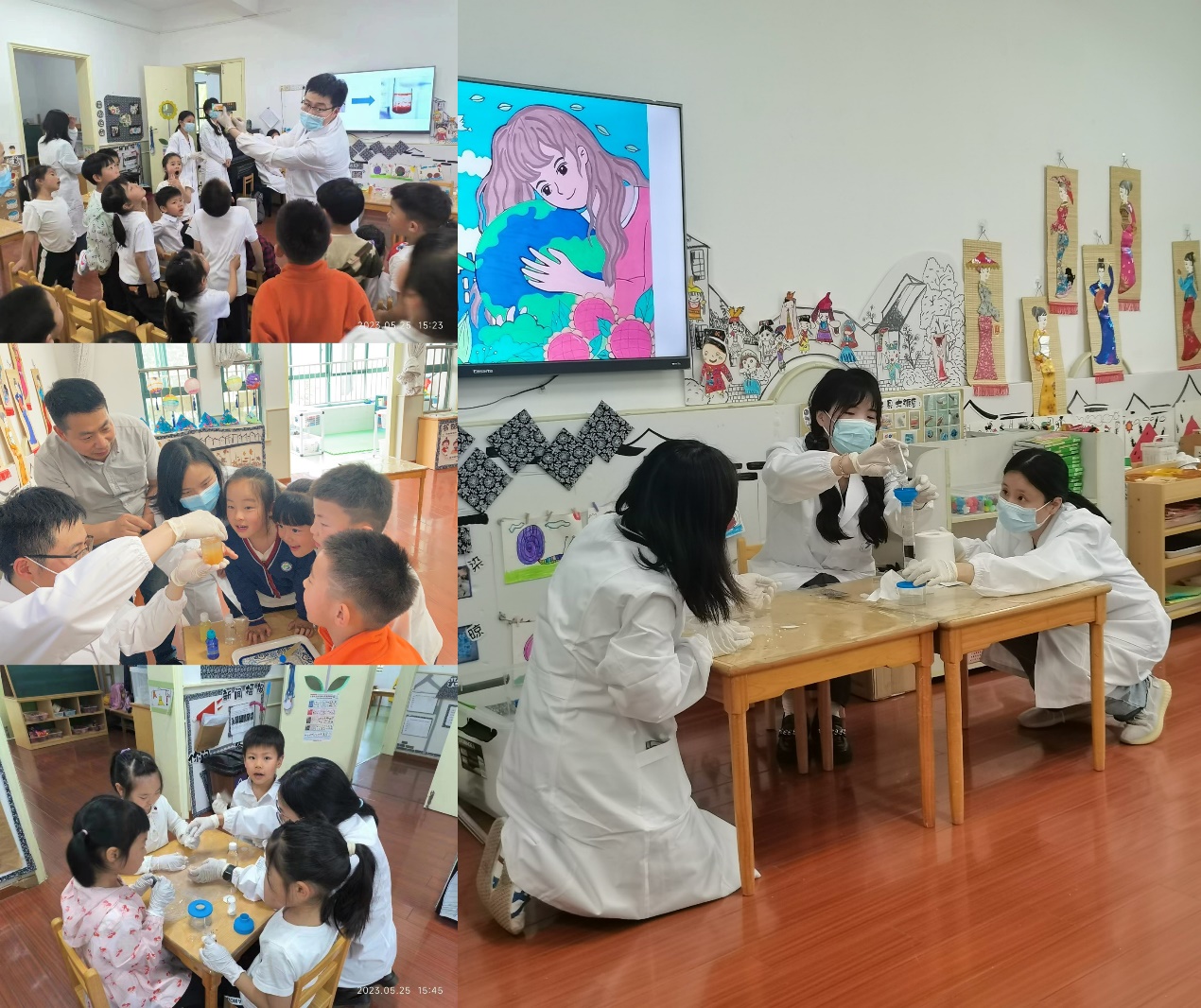 为了使科普活动达成良好效果,老师们结合幼儿园大班孩子的年龄和特点,事先做了大量准备工作。环境教工党支部顾敦罡老师和严丽丽老师多次在实验室讨论和优化演示实验方案,王金杰老师提供了大量实验物料,环境系李旋坤老师也为活动出谋划策。大家分工合作,只为用孩子们能看懂、听懂的方式上好一堂有趣、安全的环保科普课,让孩子们在心中埋下一颗科学的“种子”。
