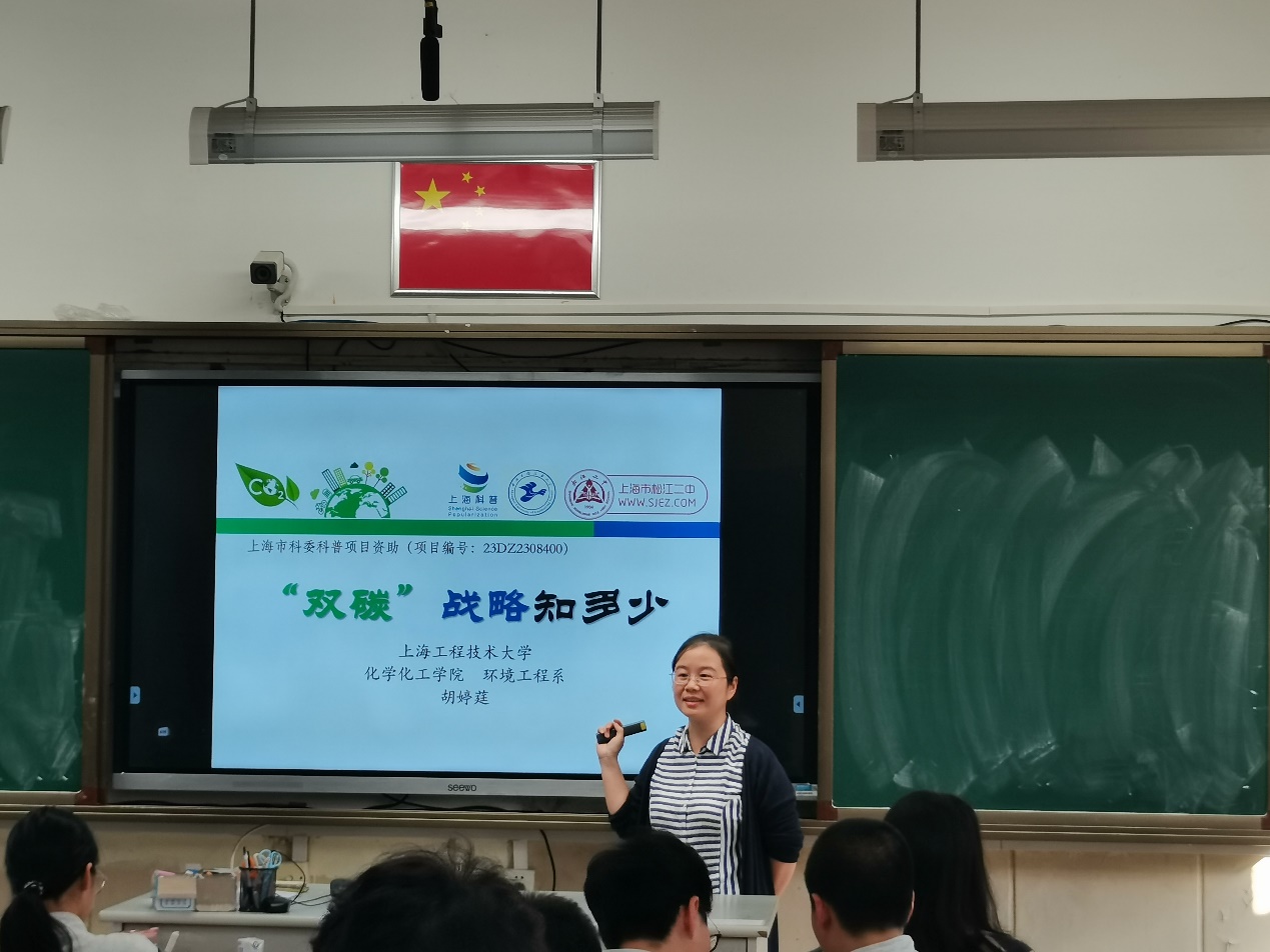 为深入贯彻落实大中小学思政教育一体化建设和《上海市绿色低碳发展国民教育体系建设实施方案》要求,充分发挥高校人才培养、科学研究和社会服务功能,10月23日下午,437ccm必赢国际环境工程专业党员教师胡婷莛、顾敦罡与硕士研究生韩梦绮一同走进上海市松江二中,为该校九年级科研兴趣班学生带来了一场生动有趣的“双碳”环保专题讲座。