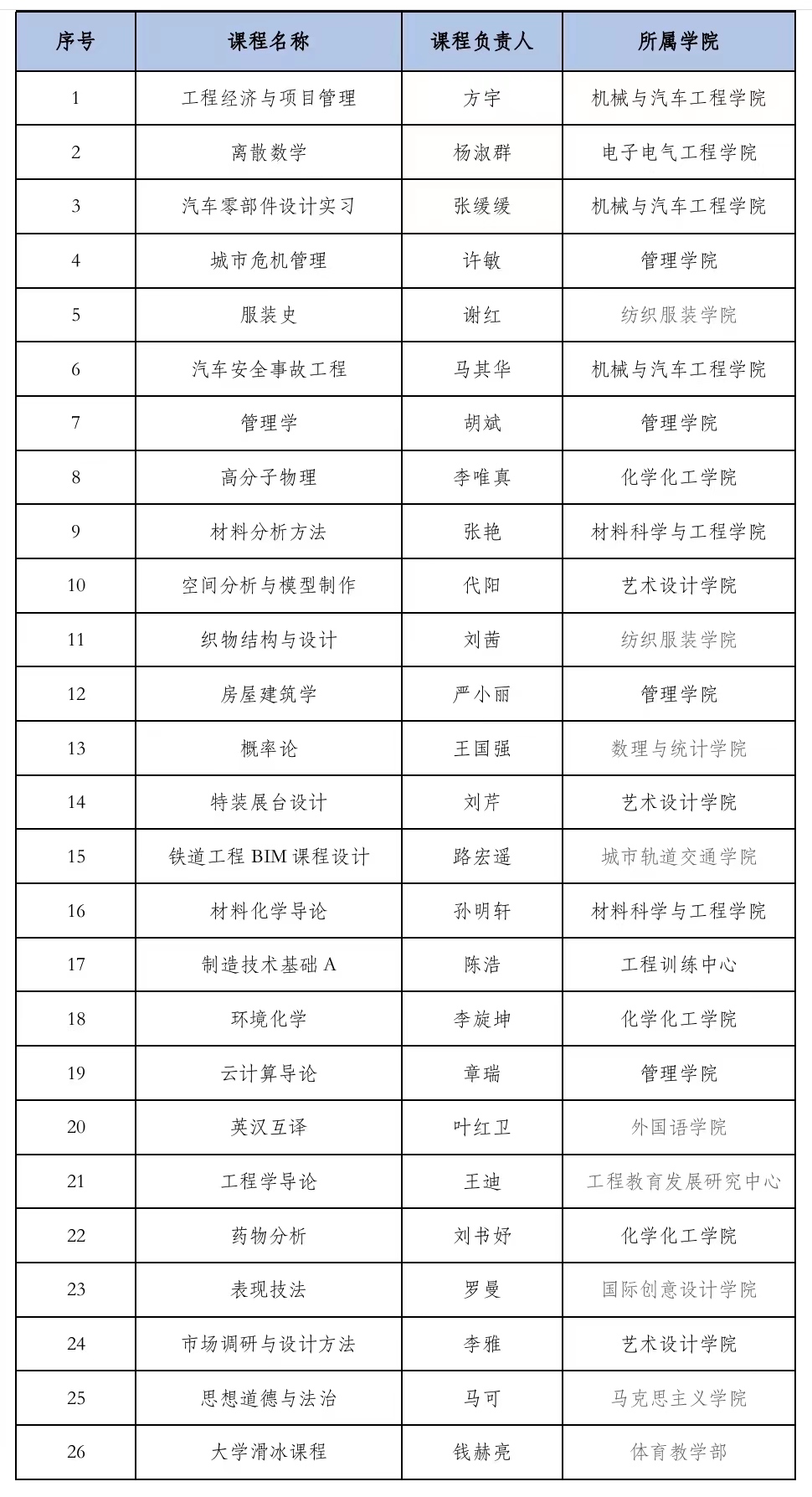近日,上海市教委发布了《上海市教育委员会关于公布2023年度上海高校市级重点课程立项名单的通知》(沪教委高〔2023〕38号),我院《高分子物理》等3门课程获得2023年度上海高校市级重点课程立项。立项课程具体名单如下: