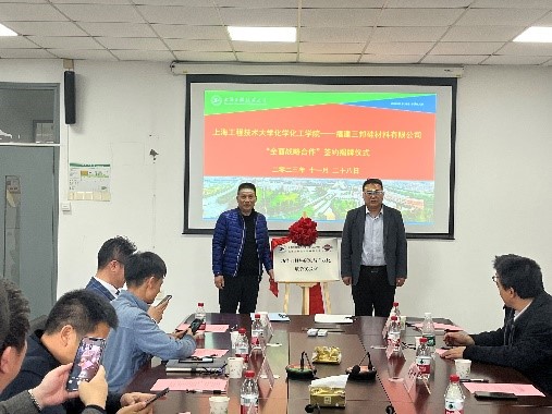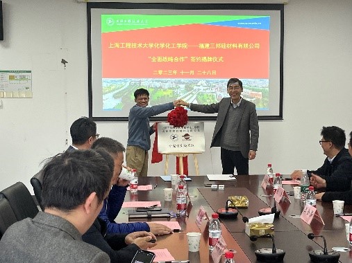 11月28日下午,437ccm必赢国际与福建三邦硅材料有限公司全面战略合作签约揭牌仪式在松江校区举行。福建三邦硅材料有限公司总经理朱华建、研发总监洪坤土、高级顾问姚卫国,高安市三邦硅材料有限公司总经理陈华林,上海舜源计算机科技股份有限公司总经理朱琦斌,广州联和化工科技有限公司市场总监陆星烨,437ccm必赢国际院长王金果,副院长陆杰、李亚,微纳制造先进材料研究中心孙韬、江振林、陈佳鹏、王宝秀、汪文君等教职员工及研究生出席活动。本次签约揭牌仪式由孙韬教授主持。